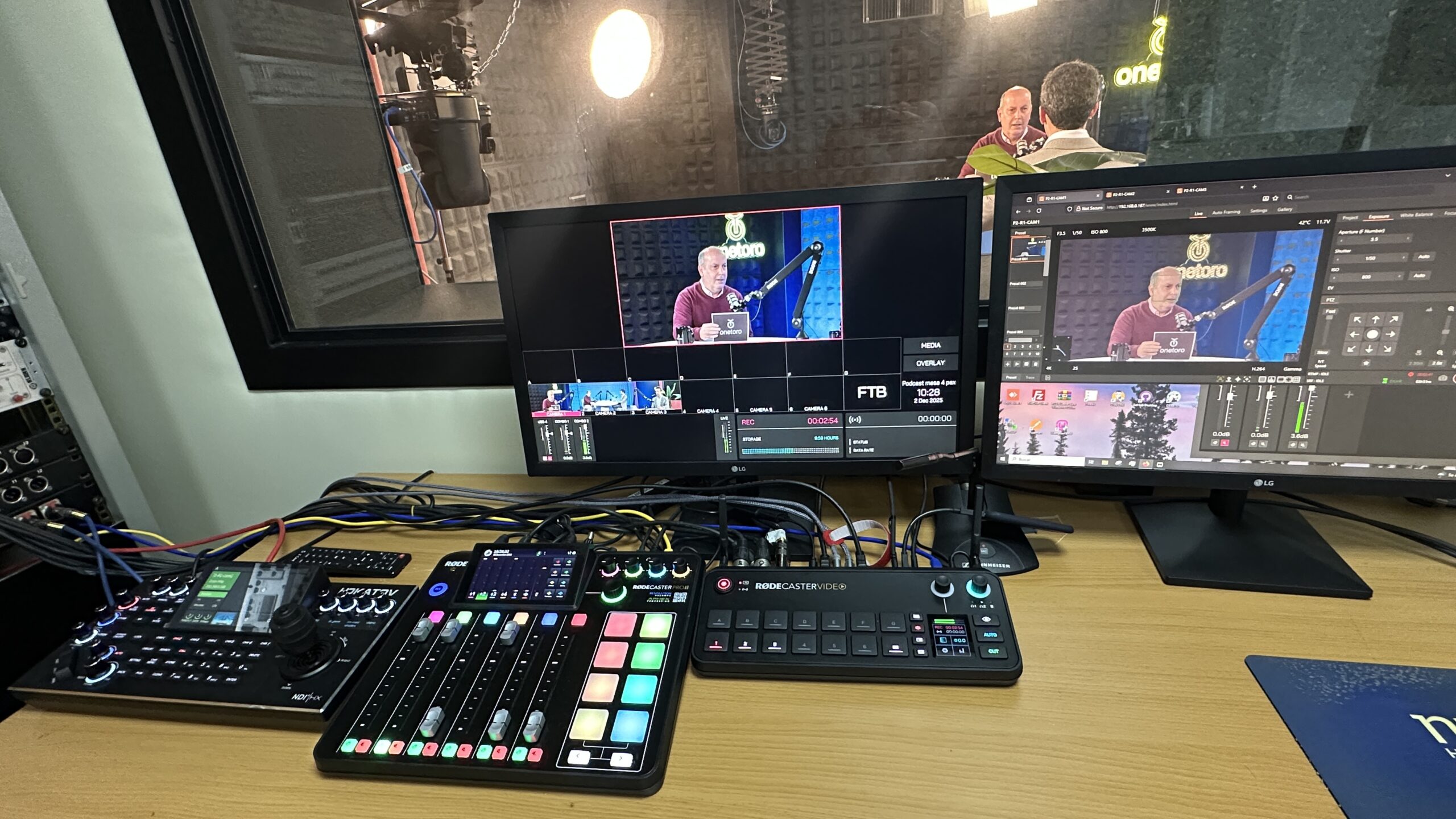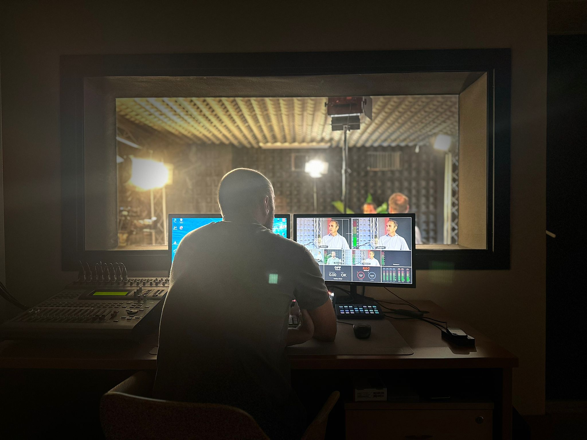 Contamos con micrófonos de alta gama, cámaras 4K, iluminación profesional, mesa de sonido, software de grabación y control técnico.